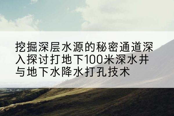 在现代社会,随着人口增长和工业发展对水资源需求的日益增大,如何有效开发和利用地下水资源显得尤为重要。其中,打地下100米深水井和地下水降水打孔技术作为两项关键技术,正在*范围内得到广泛应用。